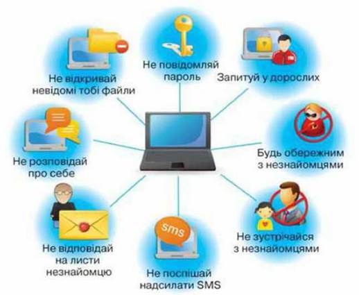 1.Небажано розміщувати персональну інформацію в Інтернеті. Персональна інформація – це ваше повне ім'я, прізвище, номер мобільного телефону, адреса електронної пошти, домашня адреса, фото з вами, членами вашої родини, друзями.