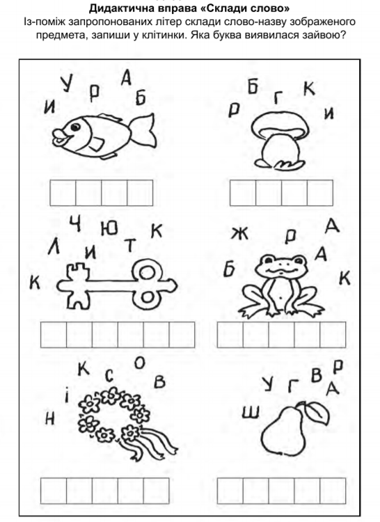 - із букв, запропонованих врозкид (4–5), складає назву зображеного предмета, визначає «зайву» букву, записує слово у клітинки;