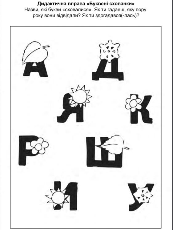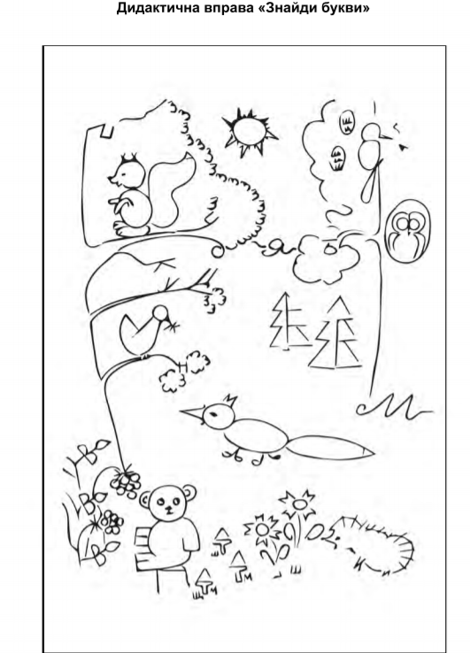 - знаходить, впізнає та називає букви у незвичному розташуванні, як складову предметних зображень;