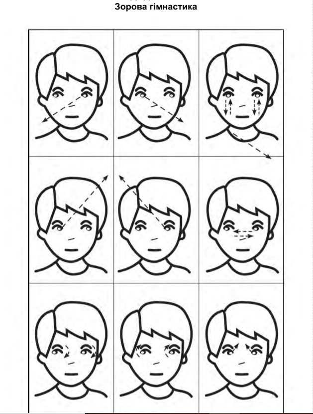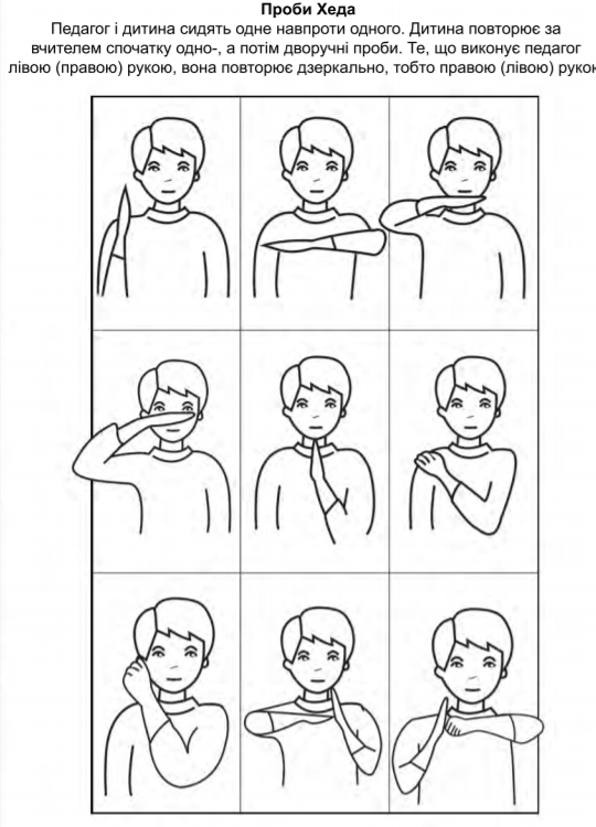 - Вправа «Повтори за мною». Дитина повинна по інструкції: а) протягнути руки вгору, вниз, направо, наліво (якщо не знає «направо», «наліво», то «на вікно», «на двері»); б) показати витягнутою рукою на названий предмет (вікно, стіл, книга і т.д.); в) намалювати крейдою (олівцем) круг (паличку, хрестик) вгорі, внизу, праворуч, ліворуч дошки (зошита).